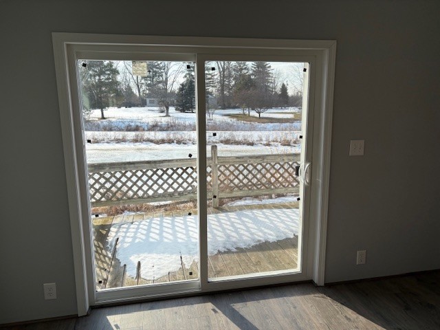 New sliding door with view of community pond.